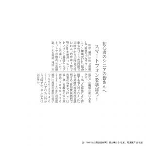この度、山陽日日新聞に「ベネシードカルチャークラブ スマートフォン&タブレット教室 福山幕山台教室・尾道瀬戸田教室」が共催したスマートフォンの無料体感講座の案内が記事掲載されました。