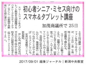 この度、「越後ジャーナル」に、「ベネシードカルチャークラブ スマートフォン&タブレット教室 新潟中央教室」が主催する、スマートフォンの無料体感講座の案内が記事掲載されました。