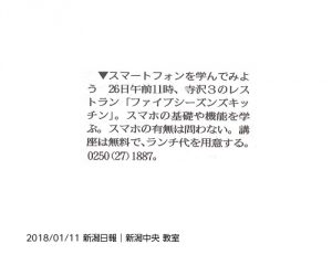 この度、新潟日報に、「ベネシードカルチャークラブ スマートフォン&タブレット教室 新潟中央 教室」が主催する、スマートフォンの体験講座の案内が記事掲載されました。