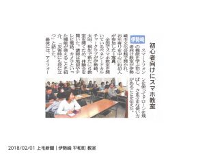 この度、上毛新聞に、「ベネシードカルチャークラブ スマートフォン&タブレット教室 伊勢崎 平和町 教室」が主催する、スマートフォンの体験講座の様子が掲載されました。