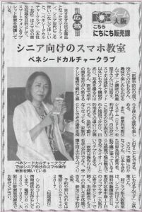 この度、「大阪日日新聞」に、ベネシードカルチャークラブスマートフォン&タブレット教室 「此花伝法教室」「守口八島教室」「新大阪東口教室」が共催する、スマートフォンの無料体感講座の案内が記事掲載されました。