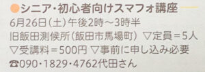 上飯田教室が、旧飯田測候所(飯田市馬場町)にて開催する「シニア・初心者向けスマフォ講座」の告知記事が「週刊いいだ」に掲載されました